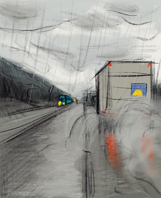 Dessin sur tablette, à la place du mort, jour de pluie avec arrêt « Chez Alex », lieu dit La Chefteuse, D420, col de Saales/Colroy-la-Roche.